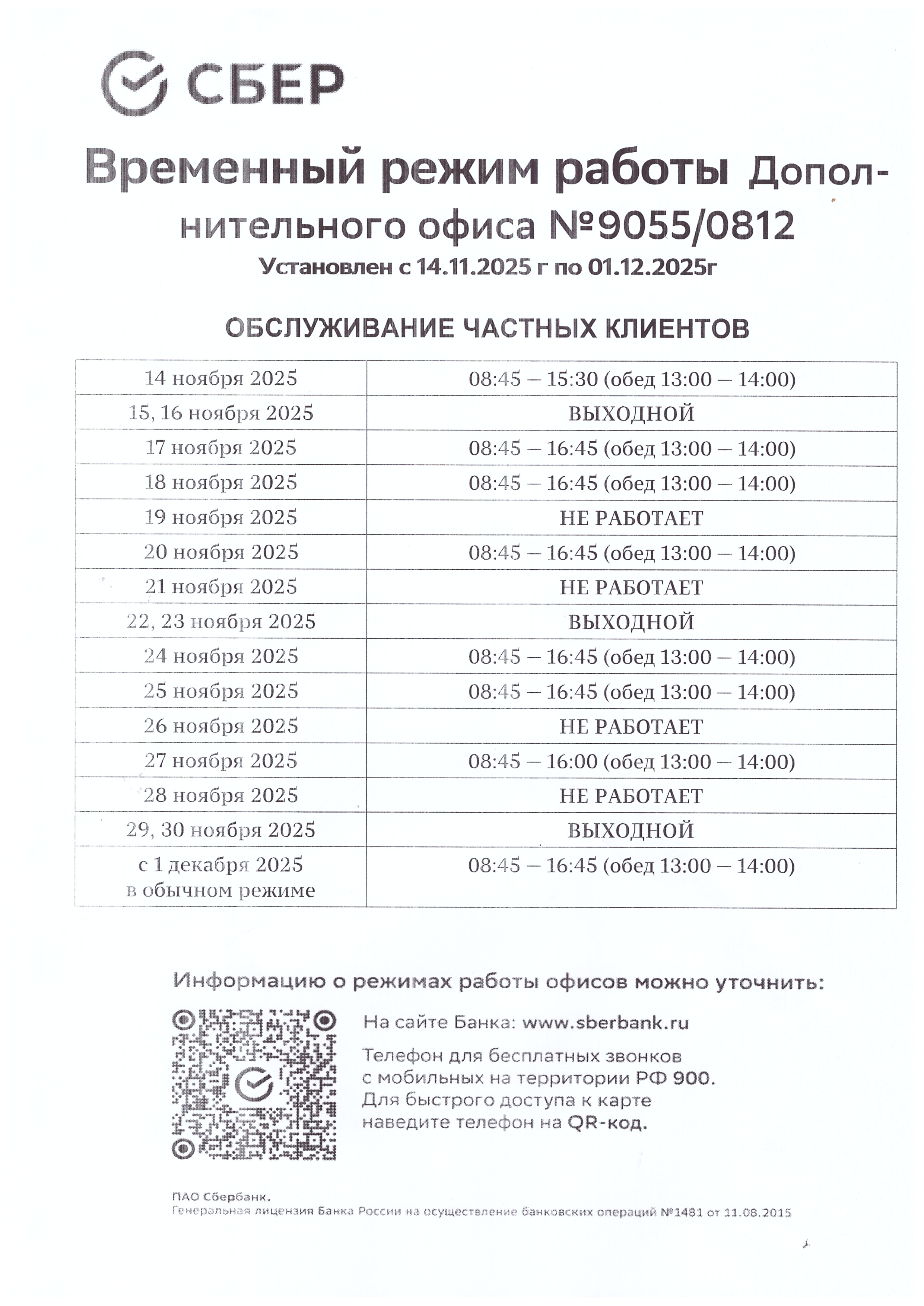 Дополнительный офис №9055/0812 Сбер с 14 ноября 2025 года по 01 декабря 2025 года переходит на временный режим работы.