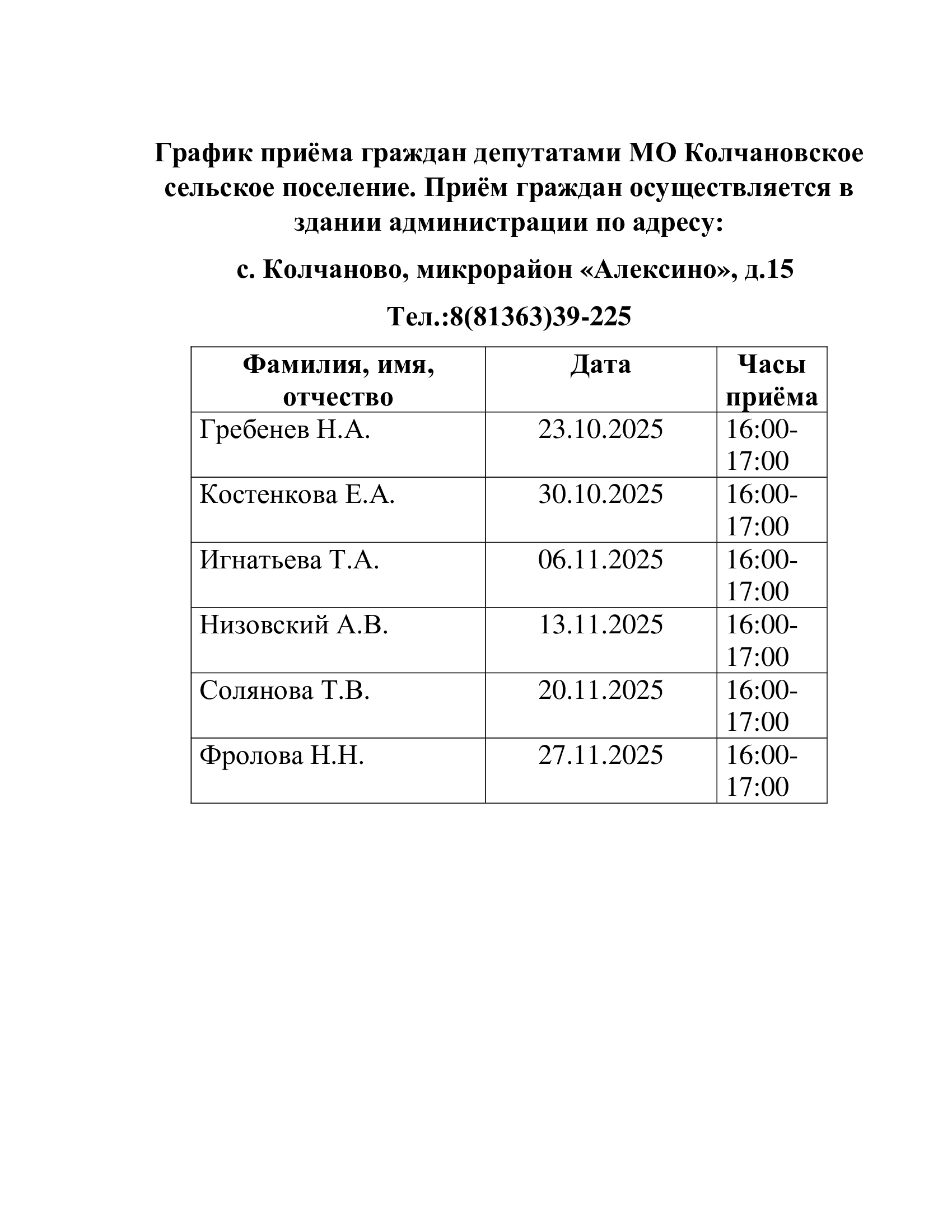 Глава администрации МО Колчановское СП Смирнов Сергей Александрович ведёт личный приём граждан каждый понедельник с 14:00 до 15:00 с предварительной записью по телефону 8(81363)39-225 с указанием темы обращения.